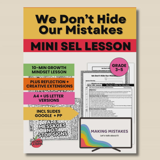This flexible SEL resource centers around the powerful message: “We don’t hide our mistakes.” Use it to spark honest conversations, build emotional resilience, and reinforce a growth mindset across your classroom routines. Whether you teach this lesson once or revisit it throughout the year, it gives you a strong foundation for creating a safe, reflective classroom community.